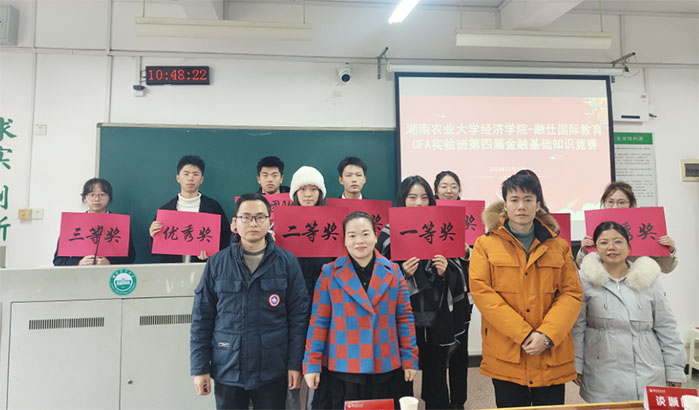 12月12日上午,湖南農業大學經濟學院聯合融仕國際教育集團在十教南223舉行第四屆CFA金融基礎知識競賽,經濟學院副院長吳玉宇教授,蔡洋萍副教授、向玉冰副教授、談顥陽博士、呂建平博士出席并擔任評委,2023級經濟學院全體CFA實驗班學生參加比賽。