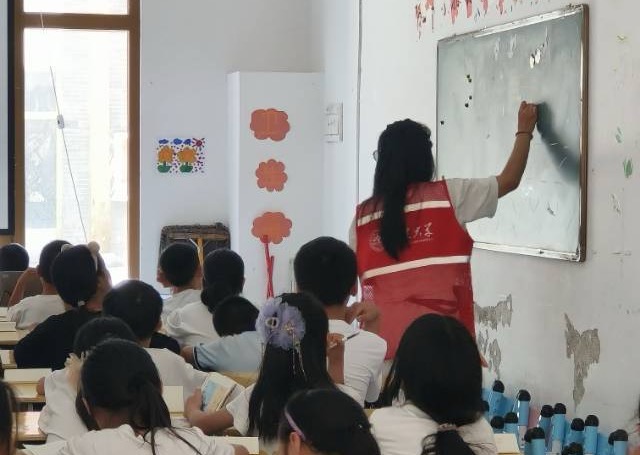 下午兩點半,支教授課正式開始。在數學課堂中,隊員馬卓鈺為學生們帶來了邏輯推理的內容,讓學生在數學知識中感受推理“環環相扣”的樂趣;在“兩彈一星”特色課程中,隊員林芷妍用認真且有趣的講述為大家介紹了“輻射”的知識,拓寬學生眼界,帶來了不一樣的科普體驗。在課程結束后的作業輔導時間中,隊員李昭燁、馬卓鈺維持自習秩序、幫助學生答疑解惑,有針對性地開展了輔導工作。