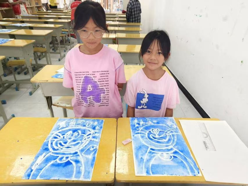中午的陽光變得熱烈,創意的種子則在葉子嘉老師的美術課上萌芽。子嘉老師帶著孩子們玩起了“水油分離”的魔法。油畫棒在紙上留下五彩斑斕的秘密,再刷上一層厚厚的水粉,那些圖案便如同沖破迷霧般清晰地浮現出來。孩子們的驚嘆聲此起彼伏,他們手中的畫筆仿佛有了魔力,畫出了星空、海洋,還有自己心中最斑斕的夢。看著那些充滿想象力的畫作,我仿佛看到了他們無限可能的未來。而在劉春輝老師的音樂課上,飄來了《如愿》的旋律。“而我將愛你所愛的人間,愿你所愿的笑顏”,這首歌的歌詞,在此情此景下顯得格外動人。孩子們的歌聲或許還帶著稚嫩的跑調,但那份清澈與認真,卻足以穿透人心。他們唱著“山河無恙,煙火尋常”,仿佛在回應著上午影片里的那些身影,也唱出了自己對未來的期盼。